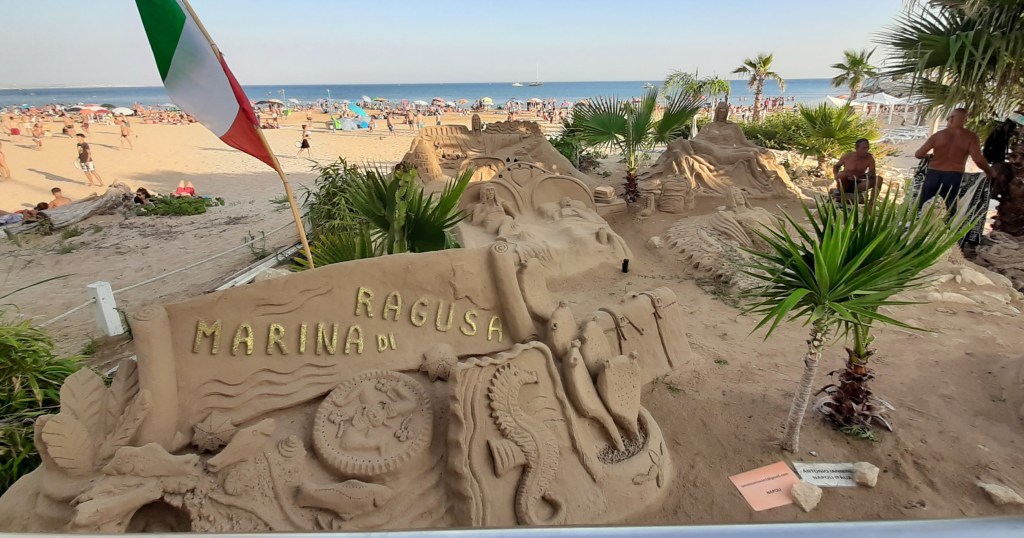 En route to Siracusa, we stopped at Ragusa and found a delightful beach town, with big sand sculptures and hoards of Italians enjoying their annual summer holiday.  There is a large marina here where people overwinter and we checked it out to see if it was an option again this year if we can’t leave the Med. It looked great – we may be returning…