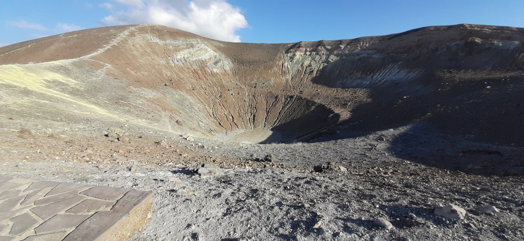 When we left a day or so later we discovered that our boat was covered in ash – tiny little hard specks of ash. It was everywhere and even after washing the boat, we were still finding black ash everywhere. The next place we visited was the Aeolian islands. Also known as The Lipari islands. The Aeolian are a group of volcanic islands off the north coast of Sicily. We visited 3 of them. The first was Vulcano where we walked up to the crater. The view was spectacular and the walk was a bit tiring but worth it. After the hike we found the town, which had lots of bars and waterside cafes, so we stopped for a sundowner before heading back. The beach had the blackest sand I have ever seen, much blacker than most volcanic island beaches – the Sicilians didn’t mind though – running down to the water burning their feet as they went.