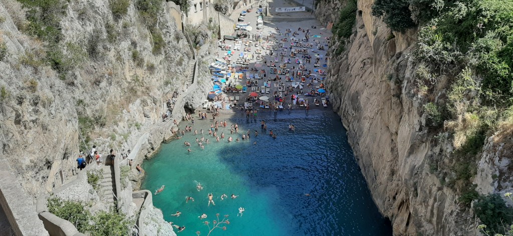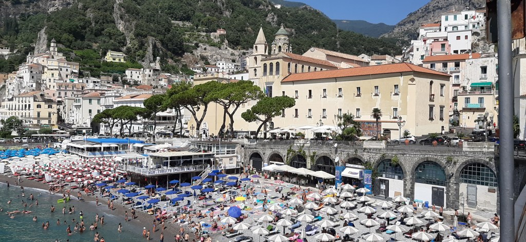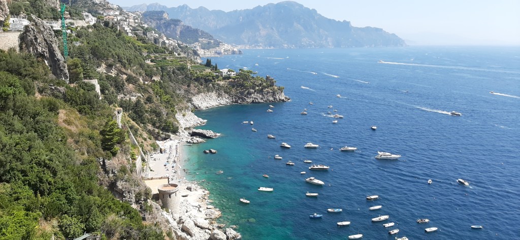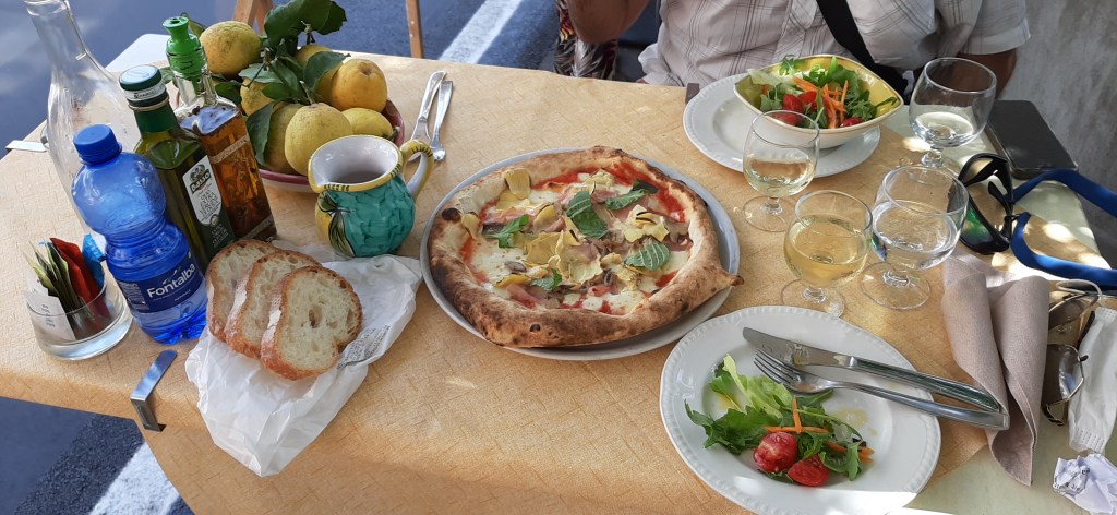When I was 18, I went along the Amalfi Coast on a motorbike with a boyfriend. 43 years later I did the same journey on a motorbike with Ian… I had forgotten how beautiful it was – with all the little bays and the colours of the water. It is one of the most famous drives in the world and everybody seemed to have the same idea. The cars sat in traffic while us on bikes were able to weave in and out. We kept stopping to look at the view and eventually arrived at Positano – a town built into the side of the hill, with restaurants and cafes lining the narrow spiral roads. Such a pretty town and crowded with Italians. The international tourists have not yet come back and it was still crowded- it must be terrible on a normal August Saturday afternoon.