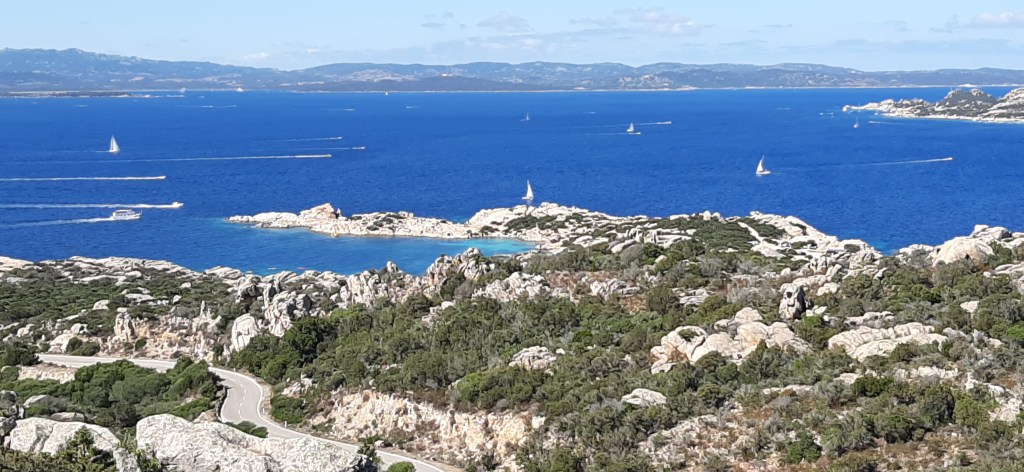 We spent the night on the island of Caprera which is attached to Maddalena by a causeway. Garibaldi’s house is on this island so we thought we would hike over to see it, but with the anchorage all to ourselves, we spent the first night just watching the sunset over the bay. We dinghied to Maddalena the next day and found a lovely little town hugging the side of the hillside with various bars and restaurants lining the seawall. We did a very touristy open air bus trip round the island, mainly because we felt sorry for the driver who was desperately trying to get some business – we weren’t disappointed as the views were to die for..