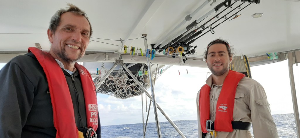 One night, about 14 days in, I handed over to Angel and headed off to bed at midnight. 2am, we heard Angel calling us so Ian got up to see what was wrong. Sometime between 1am when Angel last checked and 2am, we had 14 inches of water come up through the bilge and flood out onto the floor. The starboard hull was underwater! A bit disconcerting to say the least and we had to find the leak fast. Ian set Angel and I up with pumps while he rummaged around in the water to find the source of the leak. Meanwhile I was retrieving tin cans, fruit juice boxes and wine cartons from floating away as they had been stored in the bilge and working out what I had to take with the grab bag for 3 of us in a liferaft- extra food, warm clothing. I had a mental list of paperwork, passports, phones, log, ipad, water, and would we launch the dinghy too… I was a bit premature because Ian found the leak within a few minutes. An 10mm bolt had come out which held the dyna plate for the HF radio, so he stuck his finger in it while he tried to remember where the bung that exact size was located. Grey matter worked well and within about 5 minutes he had the hole plugged. Now it was just a case of getting rid of hundreds of gallons of water – all hands to the pump literally and we were finished by 3am. After the debrief we all realised how scary it had been, our first leak but how fast it all happened. We couldn’t even have a drink as we always sail dry….it would have to wait another 1000 miles.