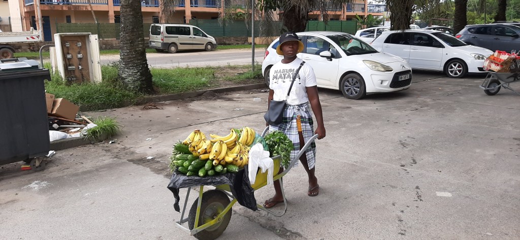 We then hit the supermarket! That is not on most tourists agenda but we had been starved of a good choice of food for a while and they took credit cards AND they had lots of french cheese and cheap wine. Laden with goodies we emerged from the SuperU supermarket and wondered how on earth we were going to get all this produce back to the boat. Mandy suggested we just take the trolleys- so we set off and walked the trolleys all the way down to the dock. We weren’t stopped by anyone but did get a few stares. When we got there – there was a group of boat owners all yelling at us to take their boat – we eventually settled on one and whoosh…. all our shopping was taken from the trolleys and whisked into the boat. Two local lads ran the trolleys back to the shop and pocketed the euro (good for them) and we climbed into the boat for the journey back to Suriname.