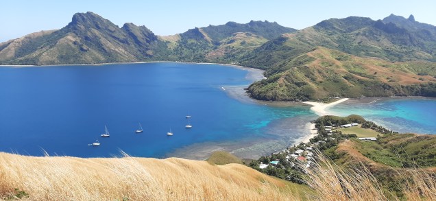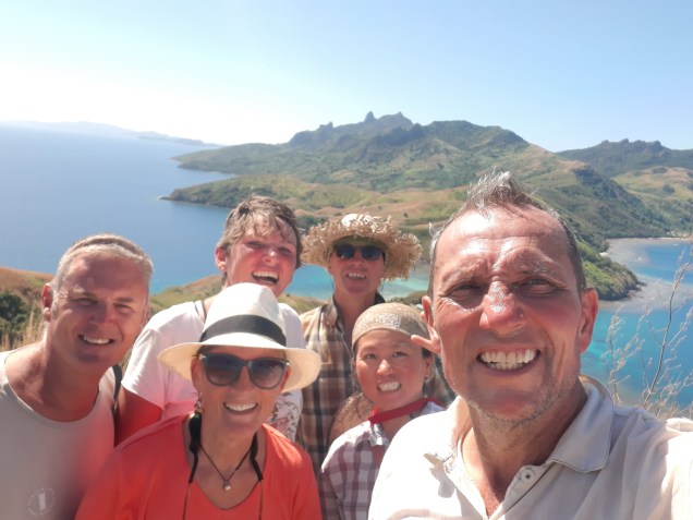 Typically the sun came out to play as soon as Steph and Paul left and we had a glorious sail to Waya island. This island has a small village that we did our first sevu sevu ceremony. This is the custom where, as visitors to the island, we find the chief and offer Kava roots as a gift. With 3 villages on the island, we had come into one that had a ‘head’ rather than a ‘chief as the Chief lived in one of the other villages but he met us on the beach and introduced himself as Jim. We were invited back to his house where we sat cross legged in a circle and after much clapping, Jim accepted our Kava and we were then invited to wander round the village, use the bay, swim, fish and snorkel wherever we wanted. We thanked him and set off to climb to the highest peak. With six of us – Indian Summer, Rosie Skye and Genesis we hiked up and were rewarded with magnificent views – Fiji is stunningly beautiful.
