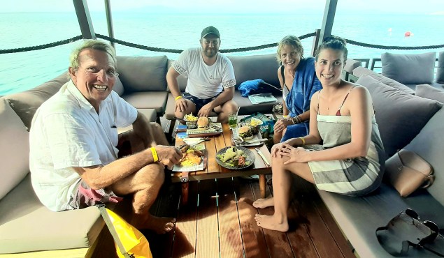 We enjoyed our few days in Savu Savu – I had a couple of cotton dresses made and we fixed a few things on the boat that needed fixing but as Steph and her partner Paul were arriving in a couple of days to Nadi on the other island we set off to pick them up. We caught a good weather window and sailed the whole way anchoring in Momi bay just on sunset. Steph was staying in a hotel on the other side of the bay and so we watched the same sunset together – just a mile apart! The next day we pulled into Vudu marina where we were having our rig replaced and where Steph and Paul came up to meet us. It was hugs all round and the champagne came out. We had seen none of our children for nearly 3 years – we had last seen Steph in London 4 months before COVID broke out and due to Australia’s locked border policy we had not been able to get back. Emily and Johnny we had last seen in the November before COVID – even longer. That evening we dined at the restaurant and stayed up long into the night catching up.